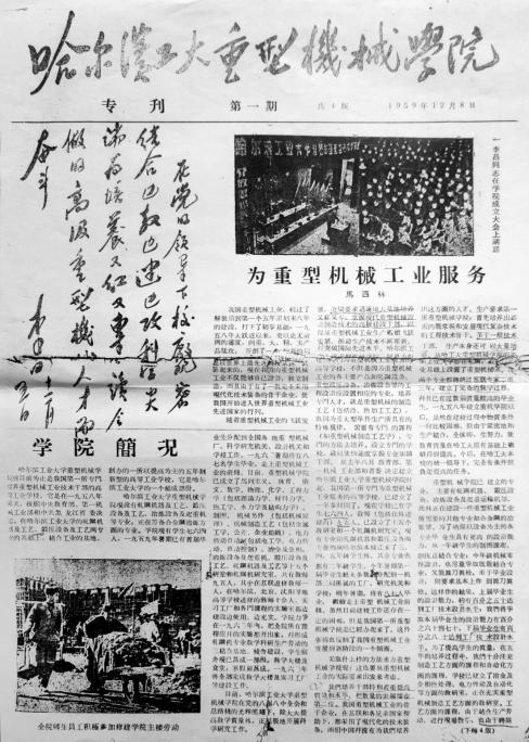 1959年12月8日,《哈尔滨工大重型机械学院报》第一期出版。哈工大校长李昌在报纸上题词:“在学校的领导下,校厂紧密结合,边教边建边攻科学尖端,为培养又红又专会读会做的高级重型机械人才而奋斗。”