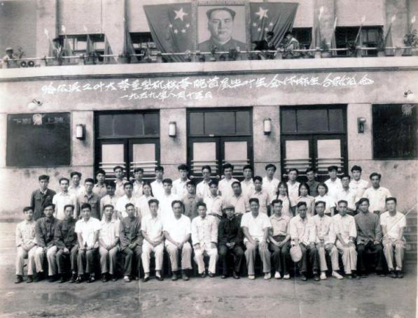 1959年8月15日,哈尔滨工业大学重型机械学院举行了首届毕业生典礼,轧钢、锻压专业首届毕业生28人顺利毕业。典礼过后,全体师生进行合影留念。