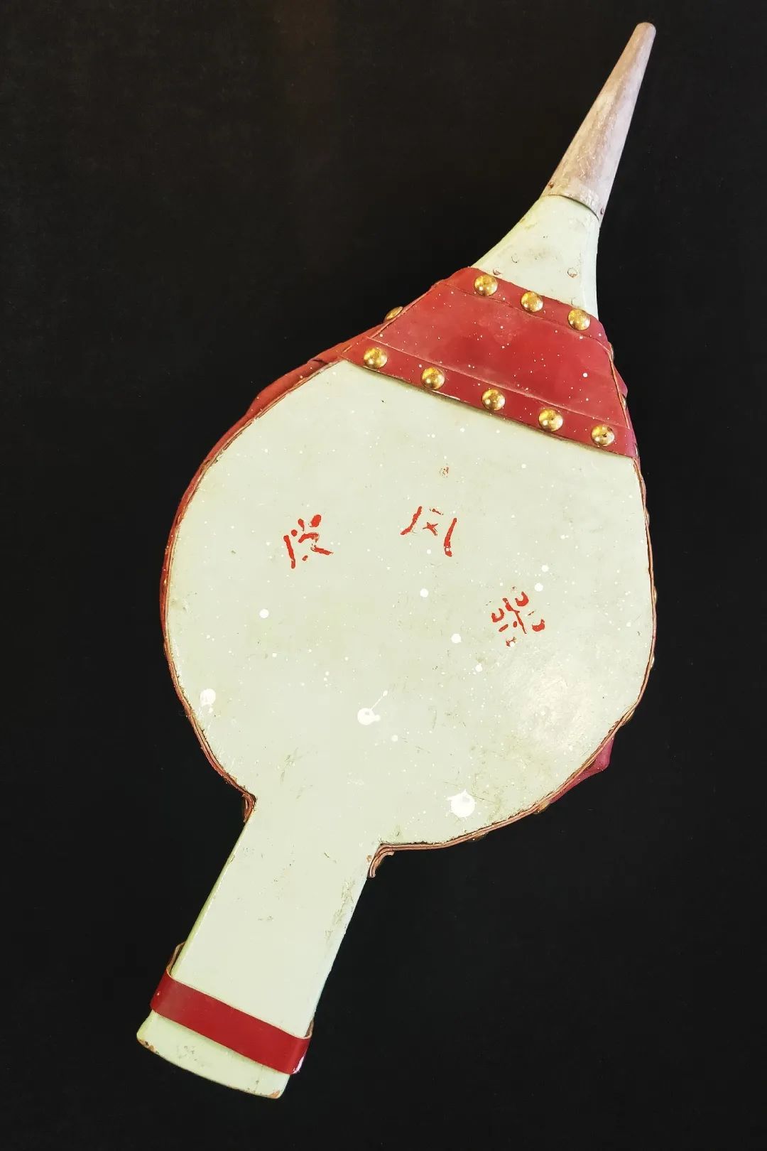 这是皮风器,为任大伟老师所捐赠。以前很少有电吹风器,多使用皮风器来给电脑等仪器设备除尘,双手握住皮风器的扶手用力一张一合,把吸进的空气快速挤压出去,有点类似于烧火做饭的风箱。