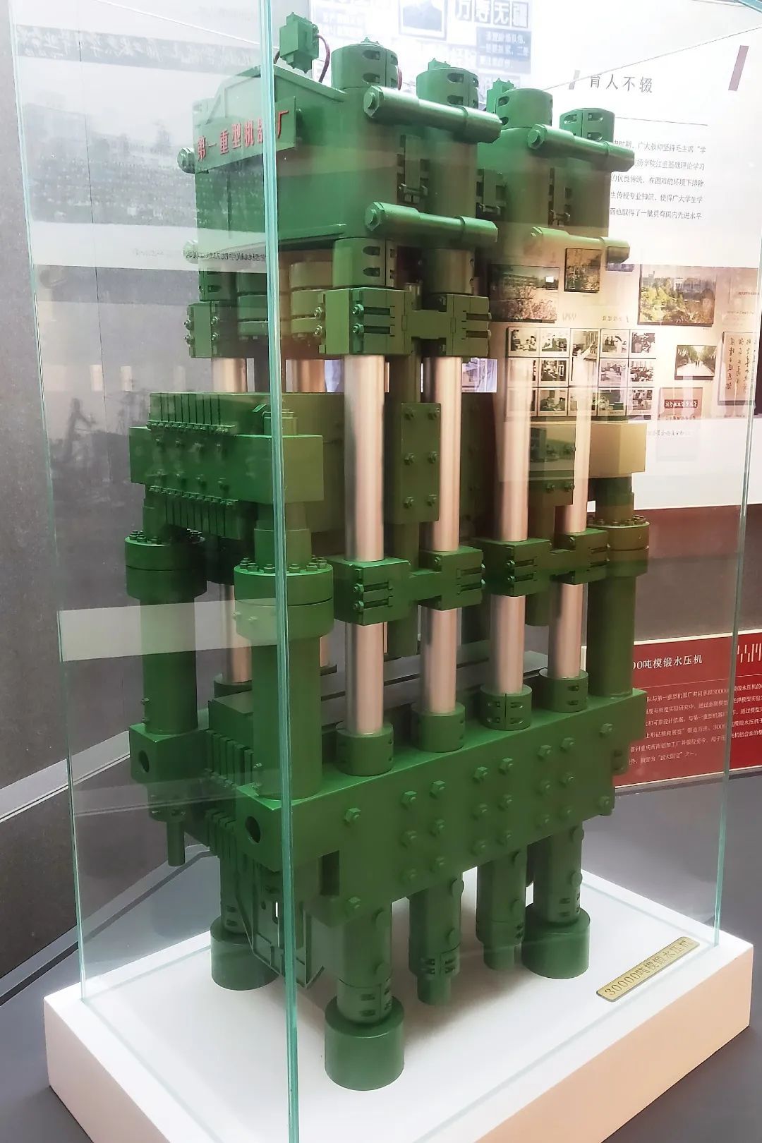 这是30000吨模锻水压机模型。1967年,林秀安教授团队与第一重型机器厂共同承担30000吨模锻水压机的研制工作。该设备1973年完工并装备到重庆西南铝加工厂,服役至今,用于压制飞机铝合金的框架、壁板等重要锻件,是国内第一个为波音公司生产零件的水压机。