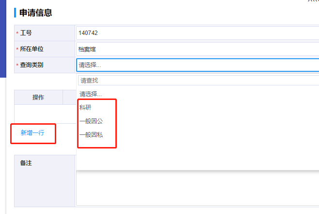 1.进入财会档案查阅审批流程,点击发起申请,选择相应的查档类别,新增一行以填写相应查档信息。