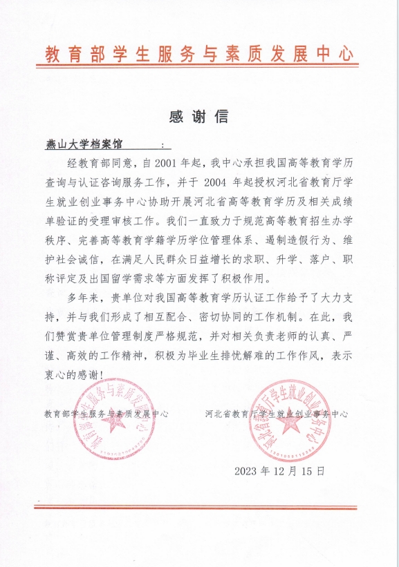 近日,我馆收到来自教育部学生服务与素质发展中心、河北省教育厅学生就业创业事务中心发来的感谢信,对我馆对高等教育学历认证工作给与的大力支持表示感谢,对我馆管理制度严格规范,相关负责老师认真、严谨、高效的工作精神,积极为毕业生排忧解难的工作作风提出了表扬。