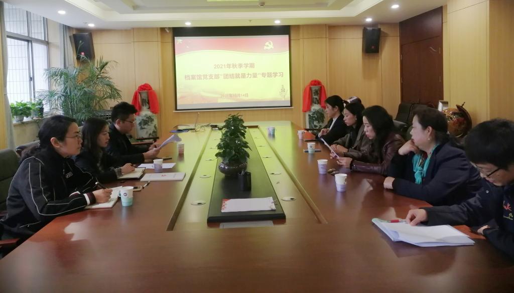 为深入领会党团结带领人民不懈奋斗的光辉历程,10月14日下午,档案馆党支部在东校区二楼会议室开展“团结就是力量”专题学习,大家共同学习了《团结就是力量》歌曲诞生的背后故事及其中蕴含的团结精神。