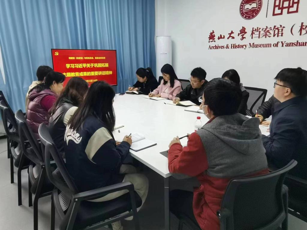 3月14日,档案馆党支部召开会议,专题学习习近平总书记关于巩固拓展主题教育成果重要讲话精神。